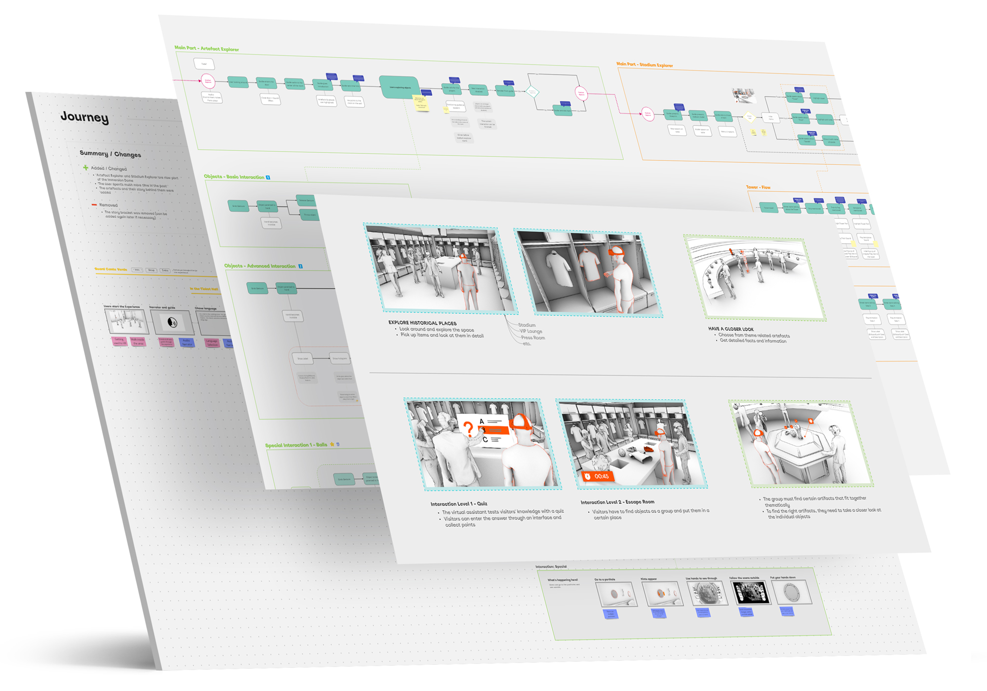 Visitors follow the European teams’ journey to the World Cup through five different scenarios. Characters guide users through the story, alternating between passive experiences and independent exploration of the environment, where they interact with artifacts and characters.
